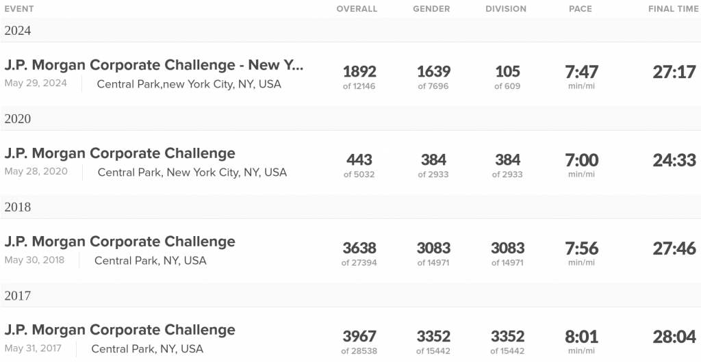 My time for JPMCC Philly was 26:57, and thanks to Athlinks it’s easy to see that it’s my personal record (if we exclude the virtual 2020 event.) Ironically, I was in my best shape during Covid years, being able to swap commuting time for running in the park.